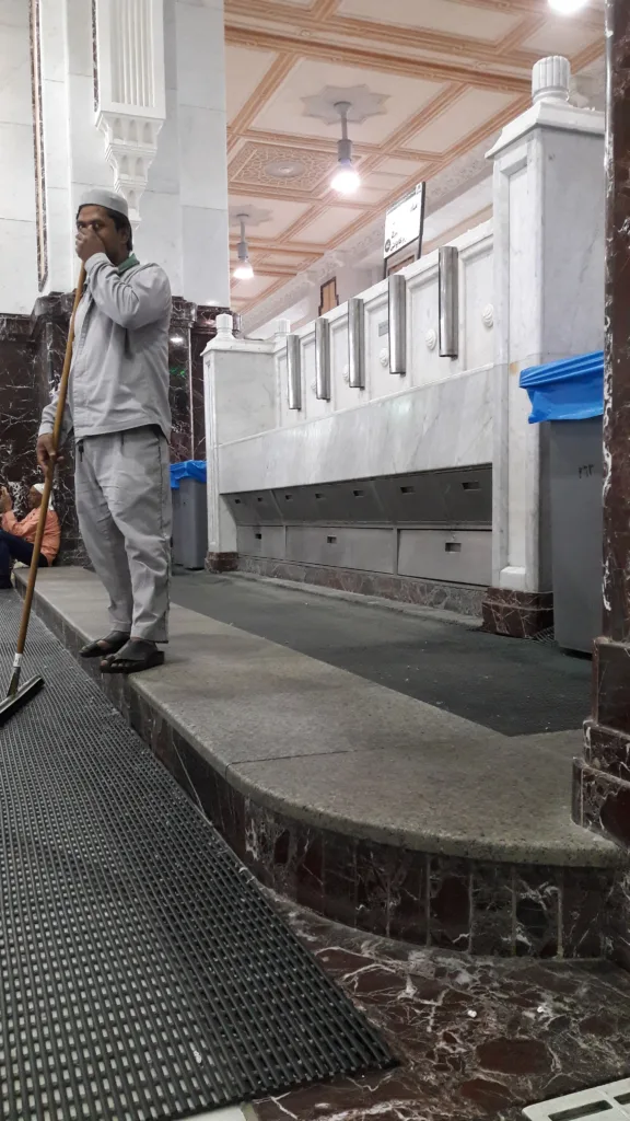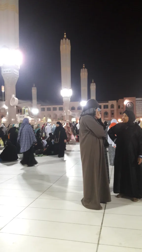 Namun, ketika di masjid banyak yang berlarian berlomba menyentuh karpet hijau. Saya dan adikku saling menjaga agar tidak ketinggalan. Kami pun terpisah dari beberapa rombongan namun kami tetap melanjutkan untuk mencari celah agar bisa bergantian sholat karena padatnya jamaah.