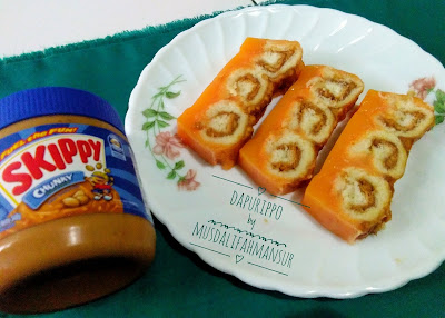 4.  Selanjutnya gulung roti yang telah diolesi selai dan susun di atas wadah. Di atas gulungan roti tadi, olesi kembali dengan selai skippy untuk mendapatkan rasa yang lebih enak.