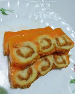 5. Setelah puding yang dimasak tadi mendidih, selanjutnya tuang kedalam wadah yang didalamnya sudah ada gulungan roti tawar yang telah diolesi selai skippy tadi.